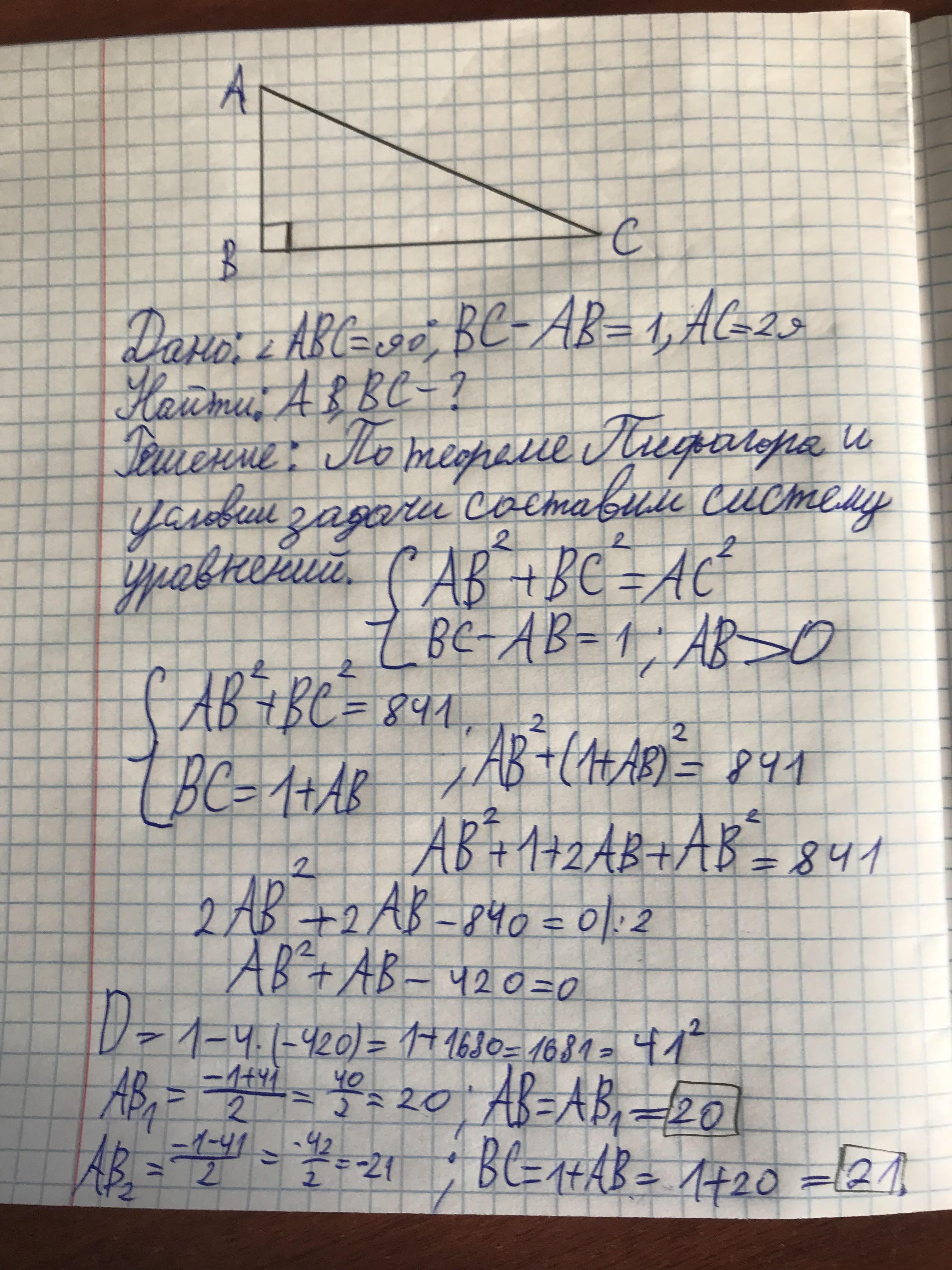 Прошу дайте решение !!!!!найдите стороны прямоугольного треугольника в котором гипотенуза равна 29 а разность катетов 1