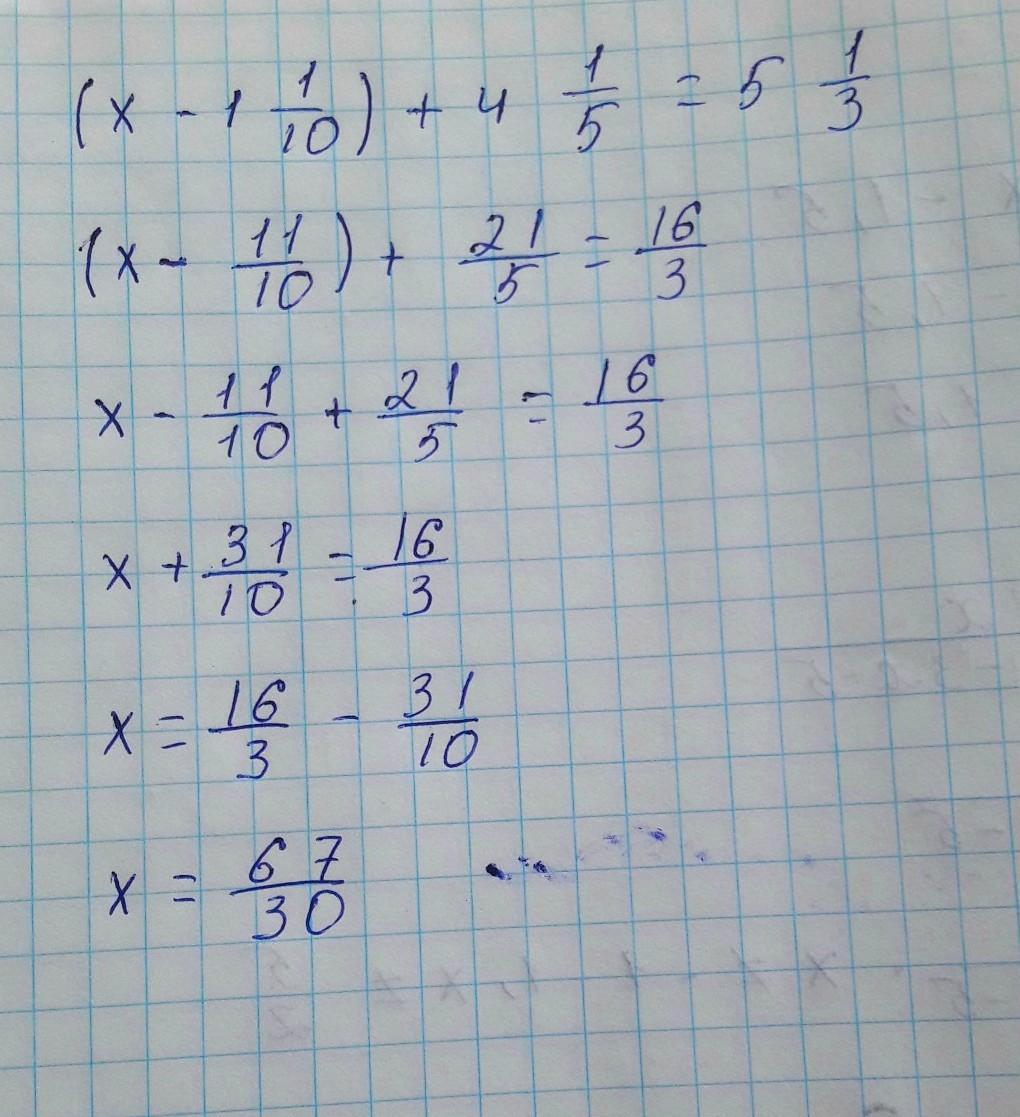 х - 1 1/10 = 5 1/3 - 4 1/5