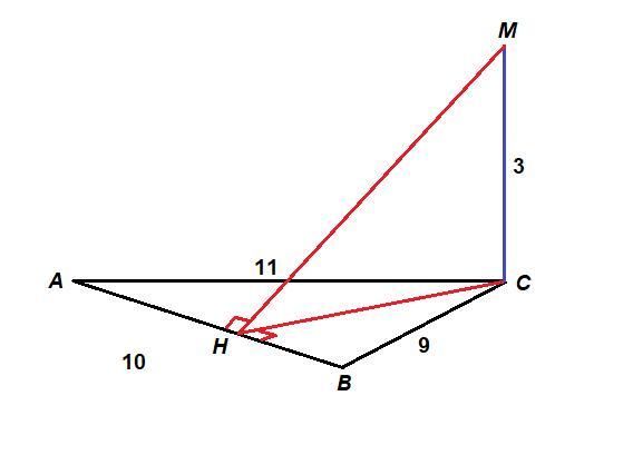 Из вершины среднего угла треугольника к его плоскости проведён перпендикуляр,равный 3 см.Определить расстояние от концов перпендикуляра до противолежащей стороны треугольника,стороны каждого равны 9 см,10 см и 11 см. Помогите, пожалуйста. Очень надо, пожалуйста