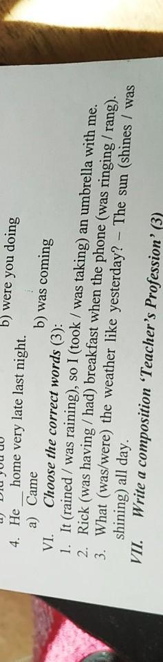 1) was raining, was taking. 2)was having, rang.3)was , was shining.