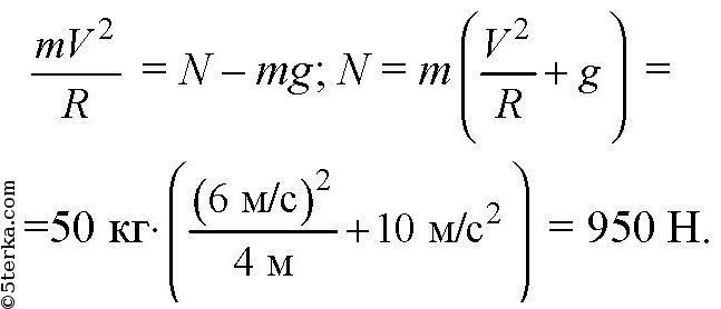 Мальчик массой 50 кг качается на качелях с длиной подвеса 4 м. С какой силой мальчик давит на сидение при прохождении низшего положения со скоростью 6 м/с?