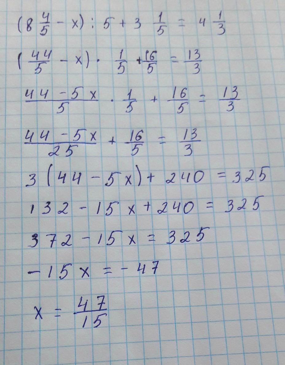 3 задание. Решите уравнение. (8 4/5-x):5+3 1/5=4 1/3