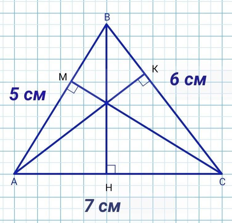 Дано: ΔАВС, АВ=5 см, ВС= 6 см, АС= 7 см, ВН⊥АС, СМ⊥АВ, АК⊥ВС