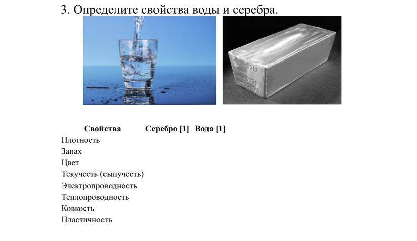 Вода - плотность средняя, запах отсутствует, цвет прозрачный, обладает текучестью, электропроводник и средняя теплопроводность, не обладает ковкостбю и пластичностью