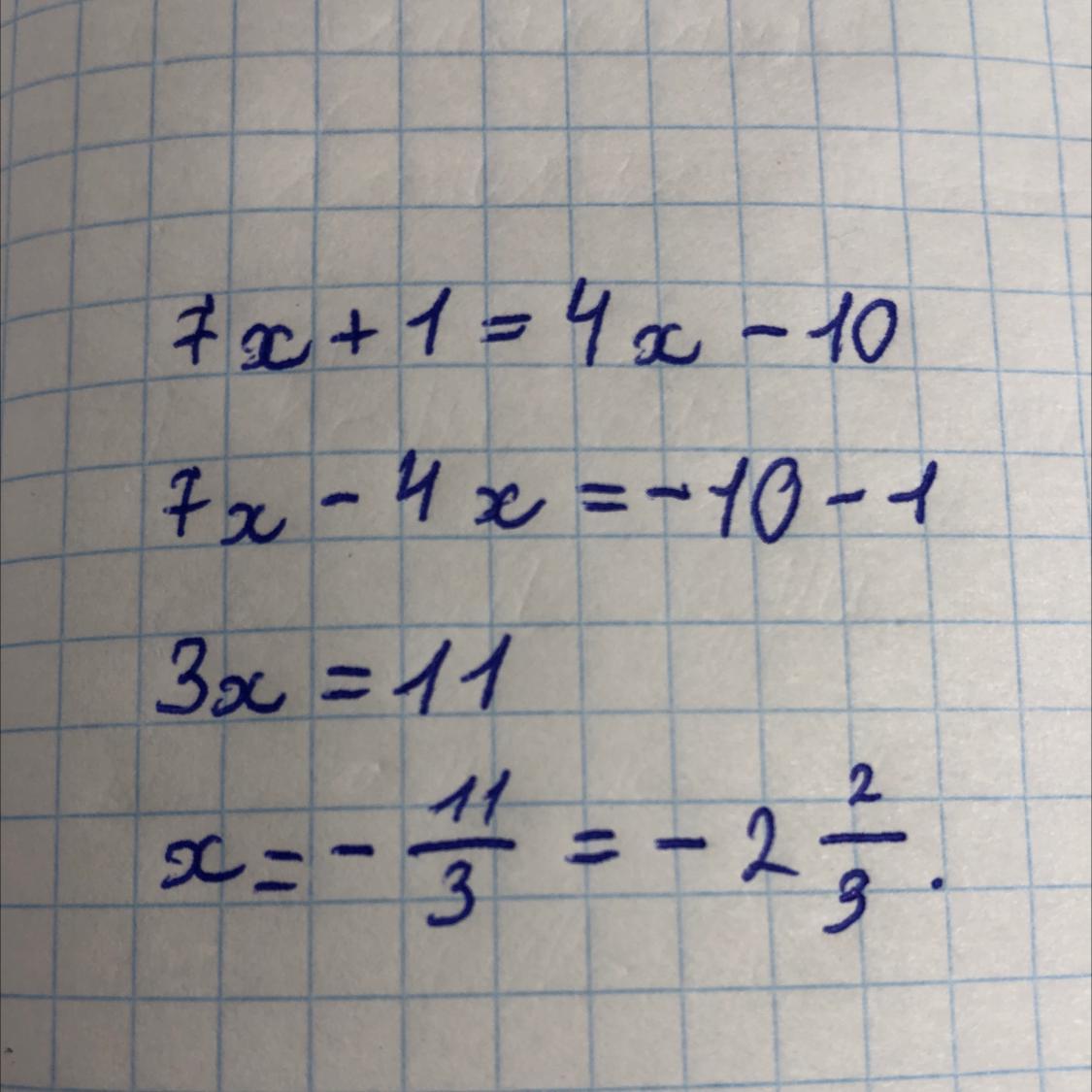 7x+1=4x-10 => 7x-4x=-10-1 =>3x=-11 => x=-11/3