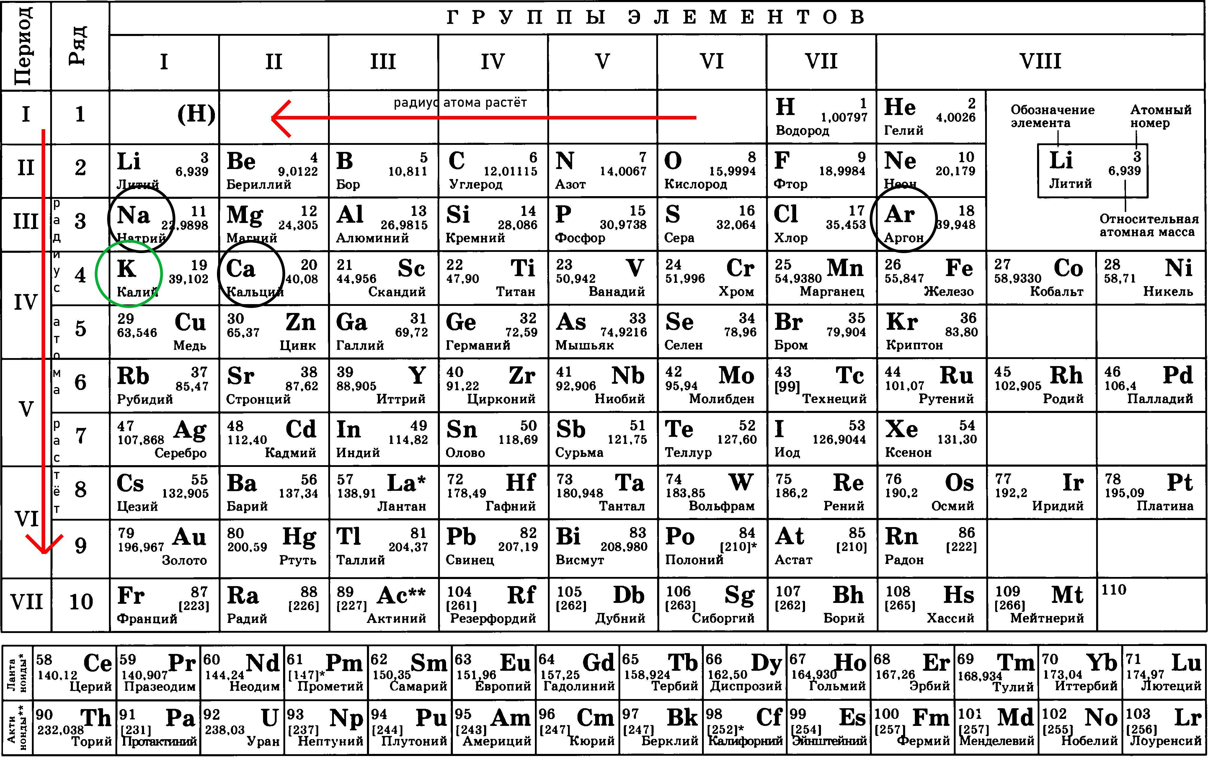 Для определения атомного радиуса воспользуемся таблицей Менделеева (прикреплена ниже). Для начала сравним калий с элементами, не стоящими с ним в одном периоде. В группе радиус атома возрастает сверху вниз, так как с каждым новым периодом увеличивается число электронных слоёв, а следовательно атом становится больше. Калий по группам стоит дальше аргона и натрия, следовательно по сравнению с ними имеет больший атомный радиус. Теперь сравним калий с кальцием, так как они стоят в одном периоде. В периоде атомный радиус возрастает справа на лево. Это связано с тем, что уменьшается электротрицательность, то есть электроны слабее притягиваются к ядру, значит находятся на большем расстоянии от него и радиус атома становится больше. Значит, радиус атома калия больше кальция, и в ответ мы берём его.