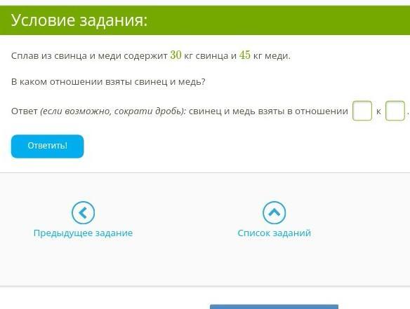 Ответ (если возможно, сократи дробь): свинец и медь взяты в отношении к .