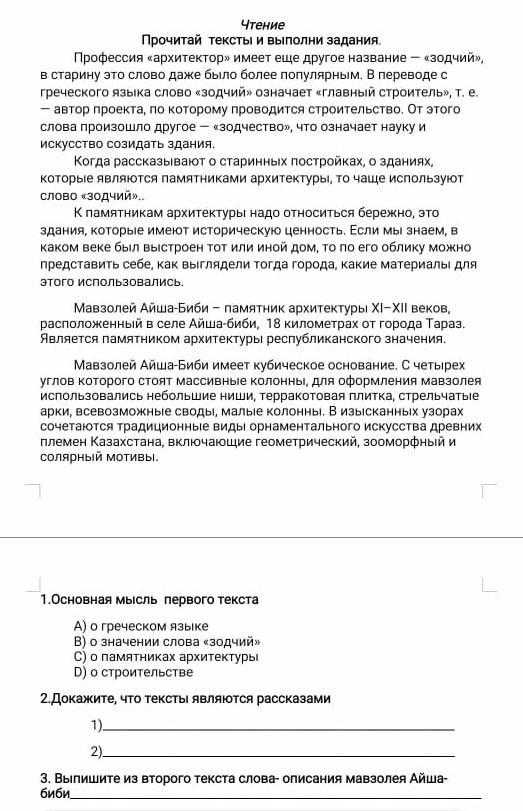 1 - B 2 - В рассказах не присутствуют волшебные моменты, в них содержание которое есть в жизни , В них нет сказочных героев. 3 - кубическое основание, массивные колонны, небольшие ниши, терракотовая плитка, стрельчатые арки, традиционные виды орнаментального искусства древних племён Казахстана, геометрический зооморфный и солярный мотивы.