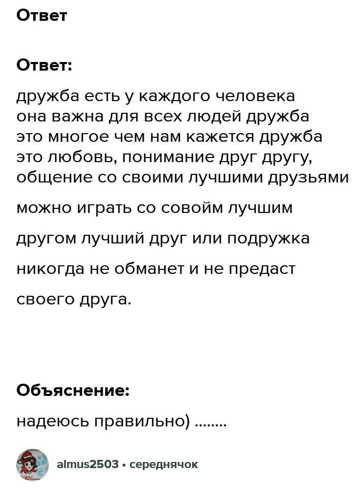 Дружба ето когда два человека имеют одинаковие интересы, признаются в беде. Я так считаю потому что ситуация в тексте била такой что мальчика обижали но за него заступился друг.Еще потому что я и мои друз'я любим делать одинаковие вещи например петь и танцевать. Вот как я понимаю значение слова ДРУЖБА.