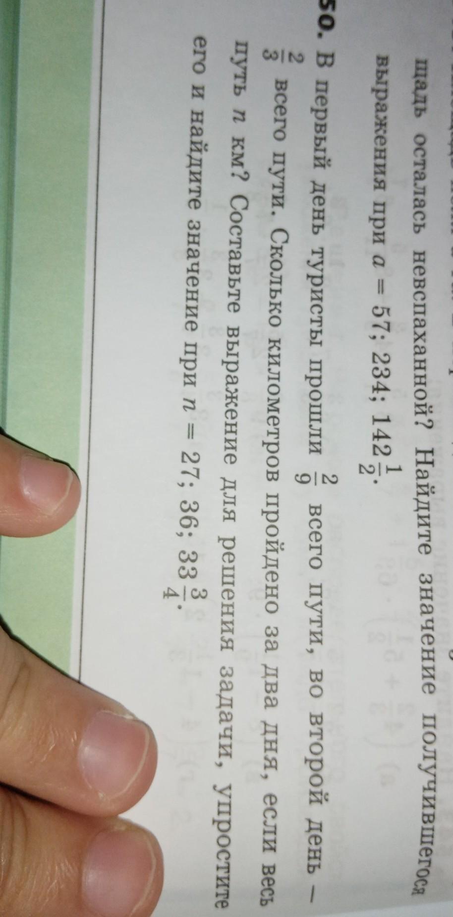 в первый день туристы прошли 2/9 всего пути, во второй день 2/3 всего пути. Сколько километров пройдено за два дня, если весь путь n км? Составьте выражение для решения задачи, упростите его и найдите значение при n =27; 36; 33 3/4