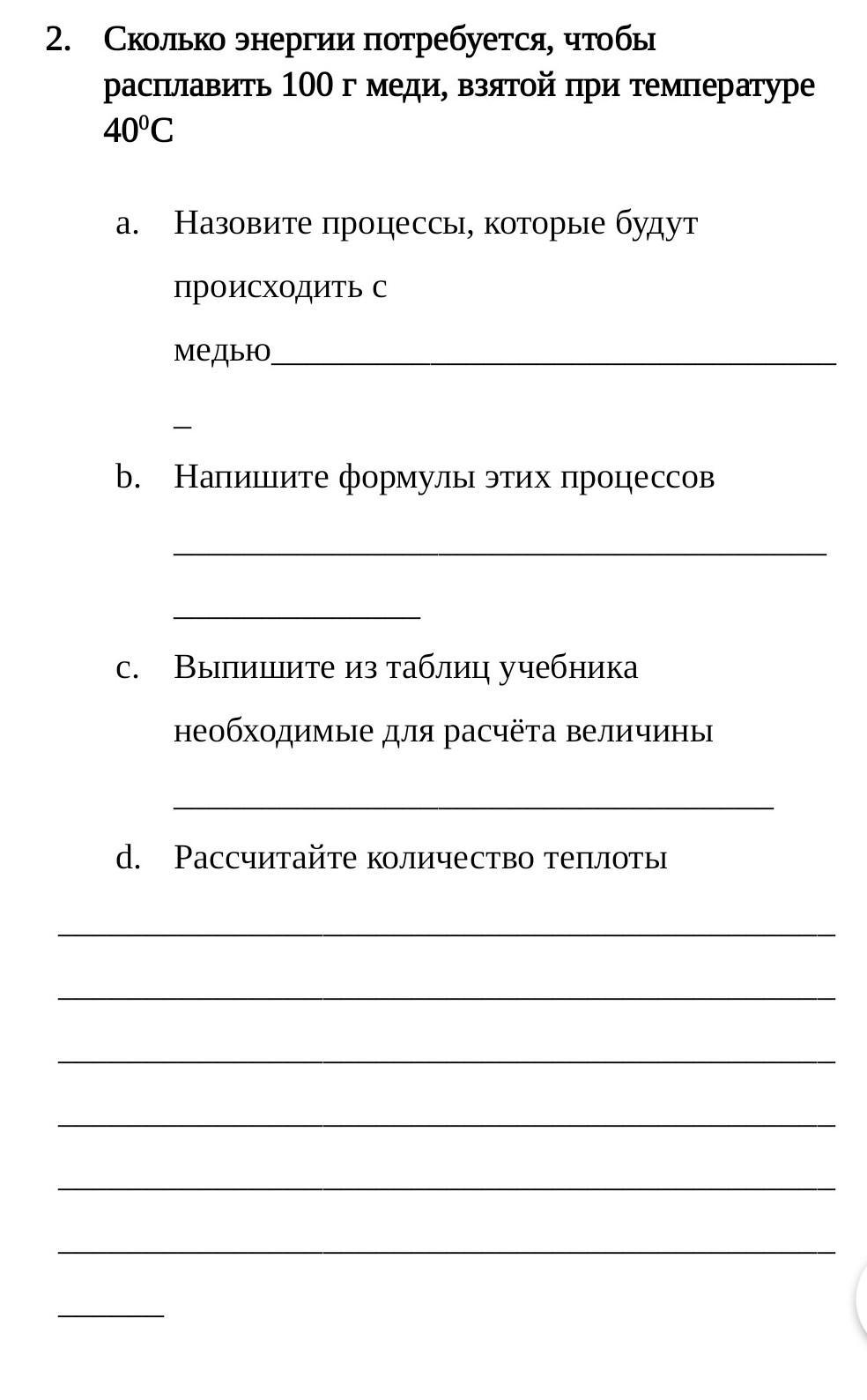 c) tплавления= 1083°С с=2400Дж/(кг*°С) - удельная теплоёмкость меди
