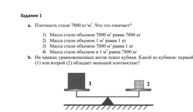b) у 1 кубика меньшая плотность, т.к. при одинаковом со вторым кубиком весе, у него больший объём