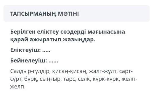 Еліктеуіш : салдыр-гүлдір,сарт-сұрт,бұрқ,сыңғыр,тарс,селк