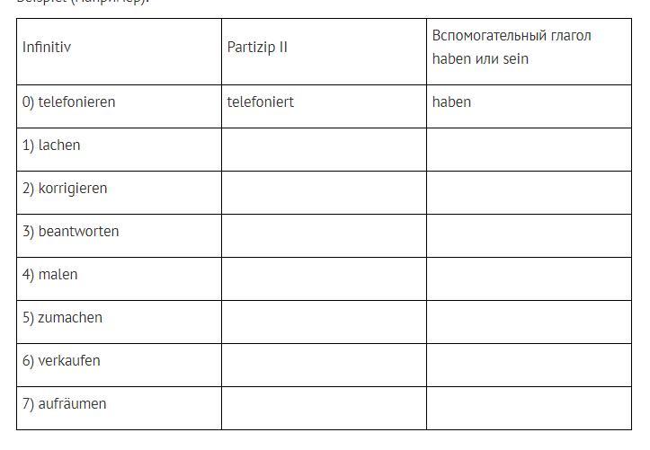 Ergänzen Sie die Tabelle. Напишите Partizip II и основной вспомогательный глагол haben или sein) предложенных слов.