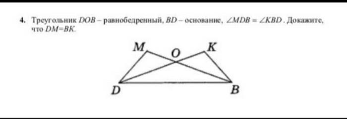 Т.к. <DOB=<KOB, <MDO=<KBO, DO=OB, то тр. MDO= тр. KBO по стороне и двум прилежащим углам, отсюда DM=KB по св-ву равнфх треугольников, ч.т.д.