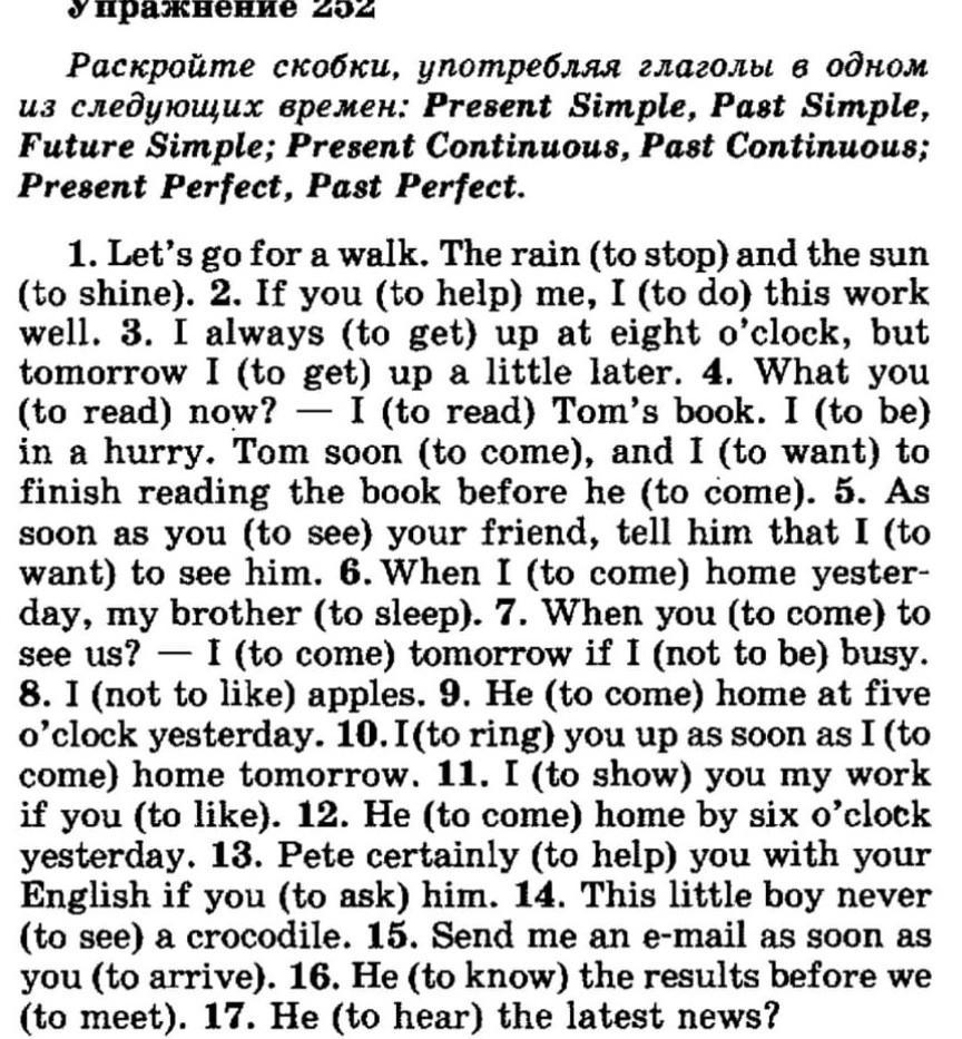 1. Let's go for a walk. The rain has stopped and the sun is shining. 2. If You help me, I shall do this work well. 3. I always get up at eight o'clock, but tomorrow I shall get up a little later. 4. What are you reading now? — I am reading Tom's book. I am in a hurry. Tom will soon come, and I want to finish reading the book before he comes. 5. As soon as you see your friend, tell him that I want to see him. 6. When I came home yesterday, my brother was sleeping. 7. When will you come to see us? — I shall come tomorrow if I am not busy. 8. I don't like apples. 9. Hecame home at five o'clock yesterday. 10. I shall ring you up as soon as I come home tomorrow. 11. I shall show you my work if you like. 12. He had come home by six o'clock yesterday. 13. Pete will certainly help you with your English if you ask him. 14. This little boy has never seen a crocodile. 15. Send me a telegram as soon as you arrive. 16. He will know the results before we meet. 17. Has he heard the latest news?