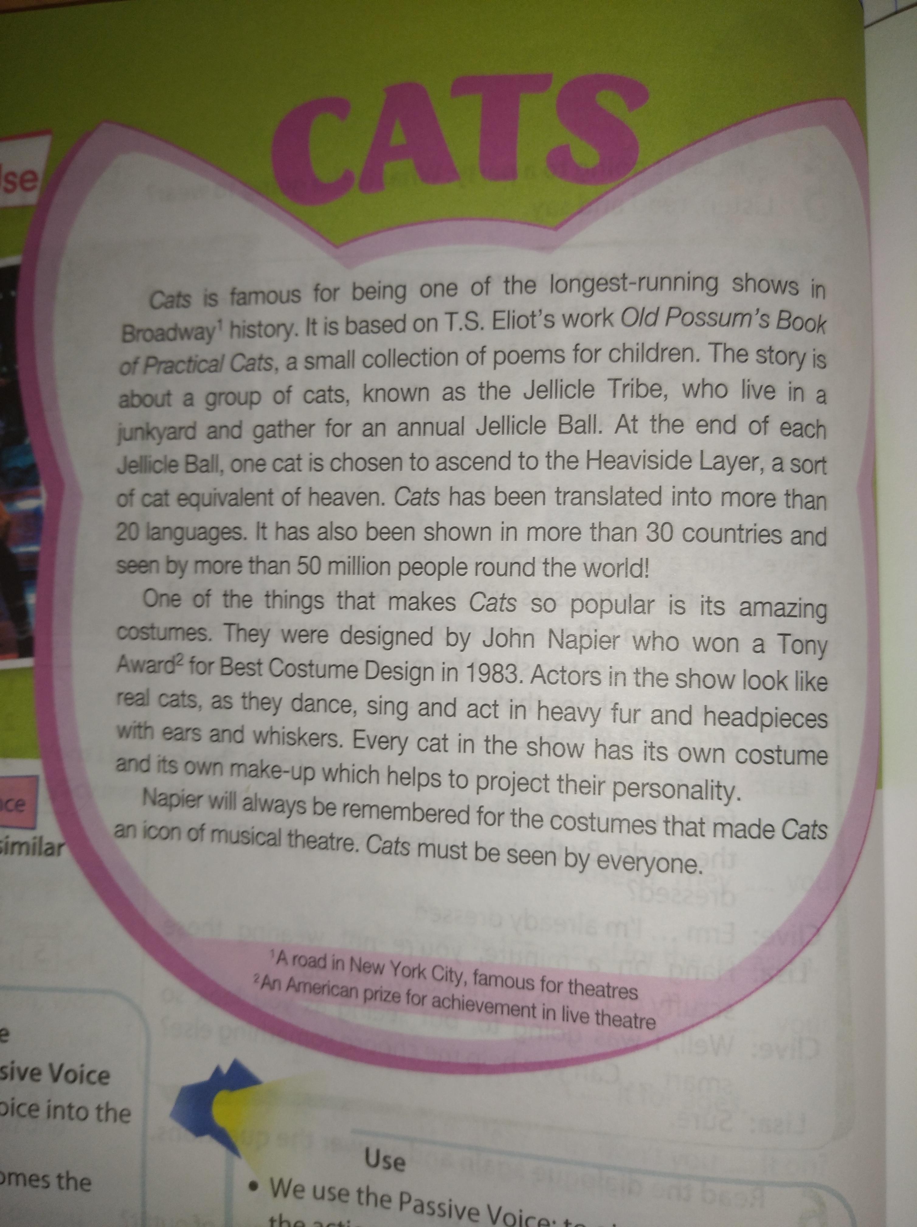 Прочитайте текст о мюзикле "Cats".Ответьте на вопросы: 1)What particularly Cats is famous for? 2) What is Old Possum's Book of Practical Cats? 3) For whom and what for an annual Jelicle Ball is held? 4) Where the musical was performed? 5) What especially Cats is loved for? 6) Have you ever seen the musical?