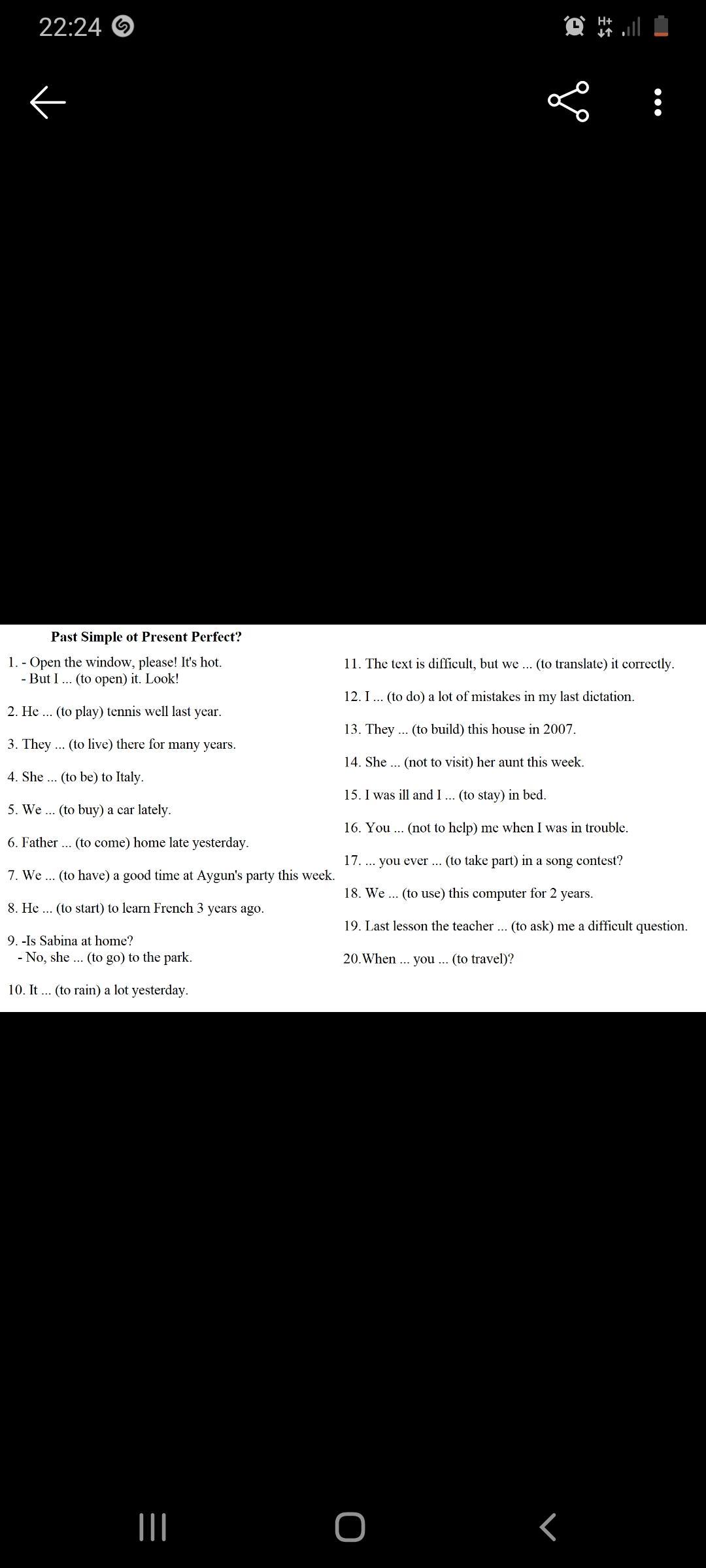 1 have opened 2 played 3 have lived / have been living 4 has gone / has been 5 have bought 6 came 7 have had 8 started 9 has gone 10 rained 11 have translated 12 did 13 built 14 hasn't visited 15 stayed 16 didn't help 17 Have you ever taken part 18 haven't used 19 asked 20 do you travel / did you travel