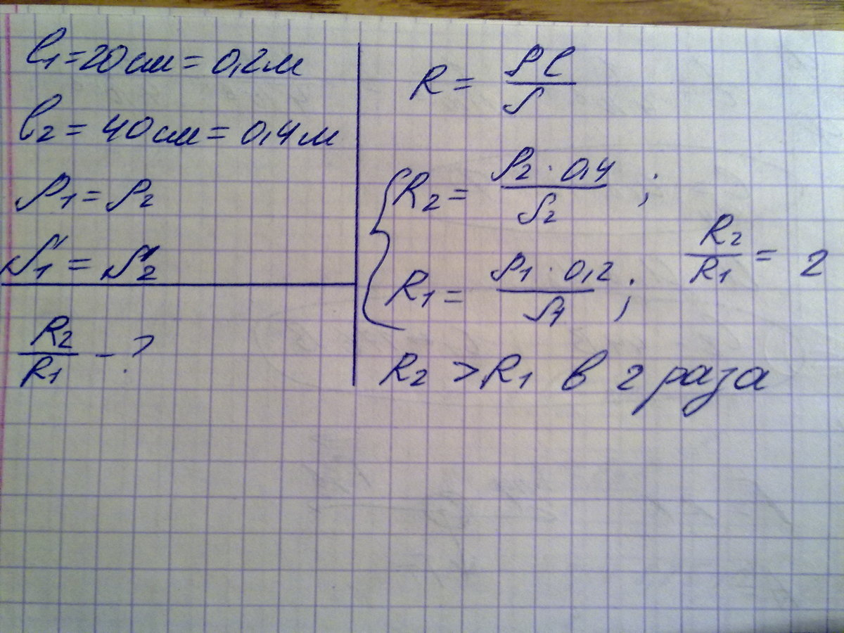 Имеются две проволоки одинакового сечения и изготовленные из одного материала. Длина одной - 20 см, другой - 40 см. Какая проволока имеет большее сопративление и во сколько раз?