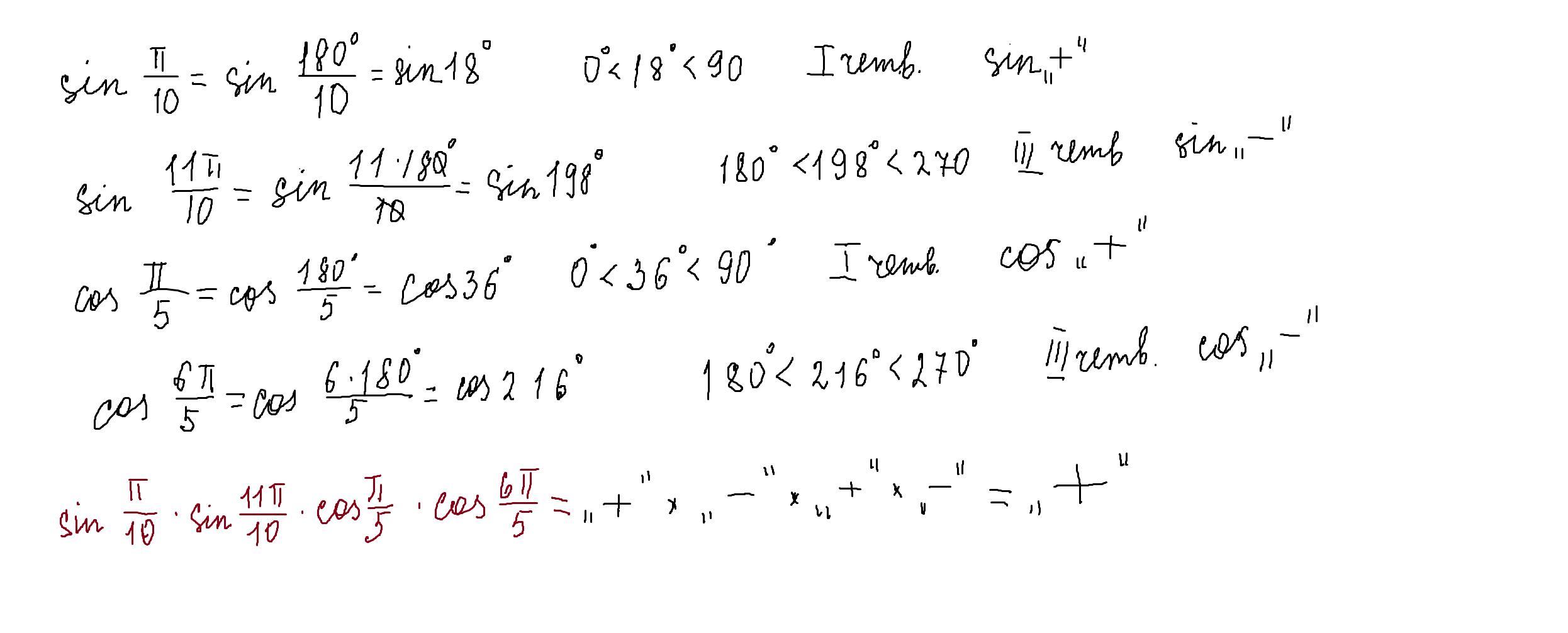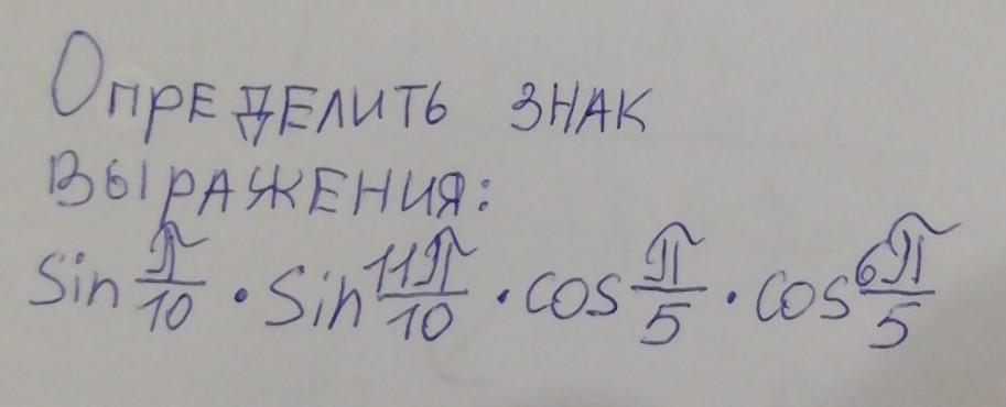 превращаем радианы в градусы и находим в какой четверти эти углы,по таблице смотрим,какой знак у этой функции в этой четверти,потом находим "произведение знаков" и получаем ответ,что знак у этого выражения "+"