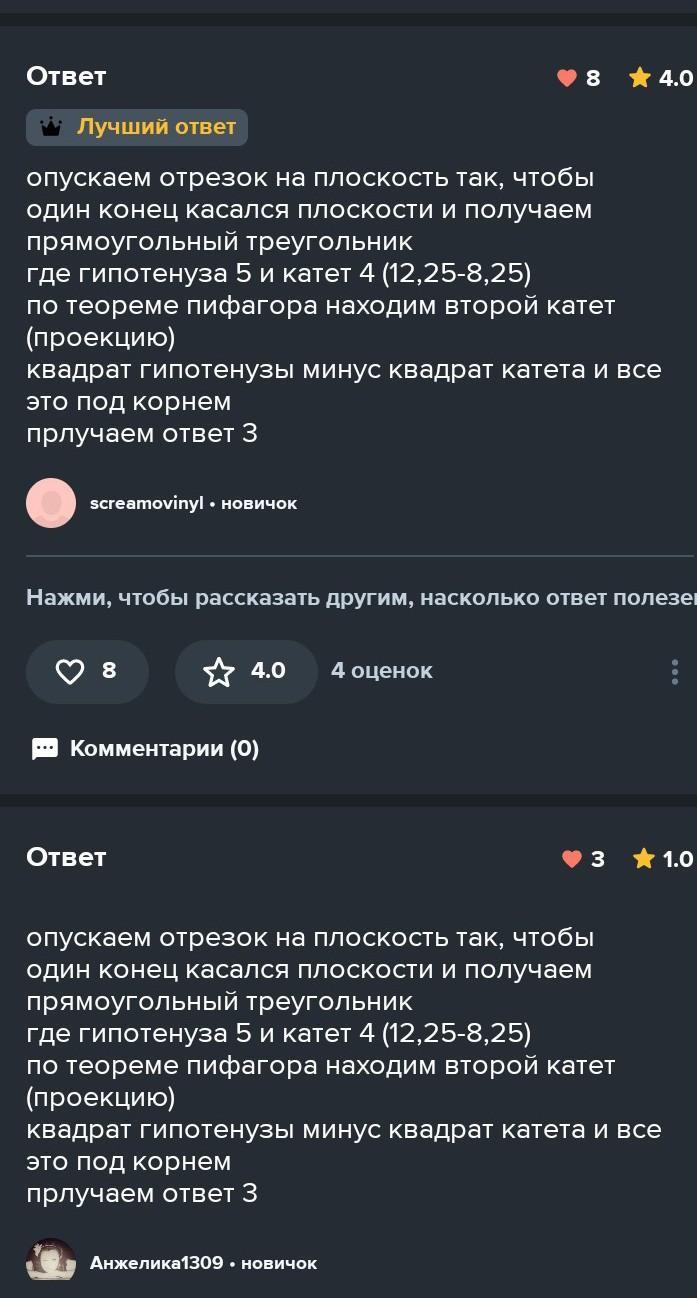 Концы отрезка длиной 5 см находятся на расстоянии 12,25см и 8,25см от плоскости по одну сторону от неё. Найдите длину проекции данного отрезка на эту плоскость.