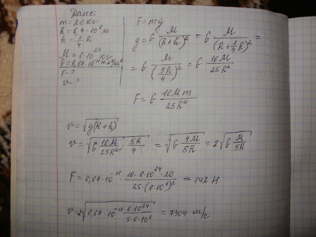 Визначте силу тяжіння, яка діє на тіло масою 20 кг, якщо це тіло підняте над поверхнею Землі на відстань, що дорівнює чверті радіуса Землі. Визначте першу космічну швидкість на цій висоті.