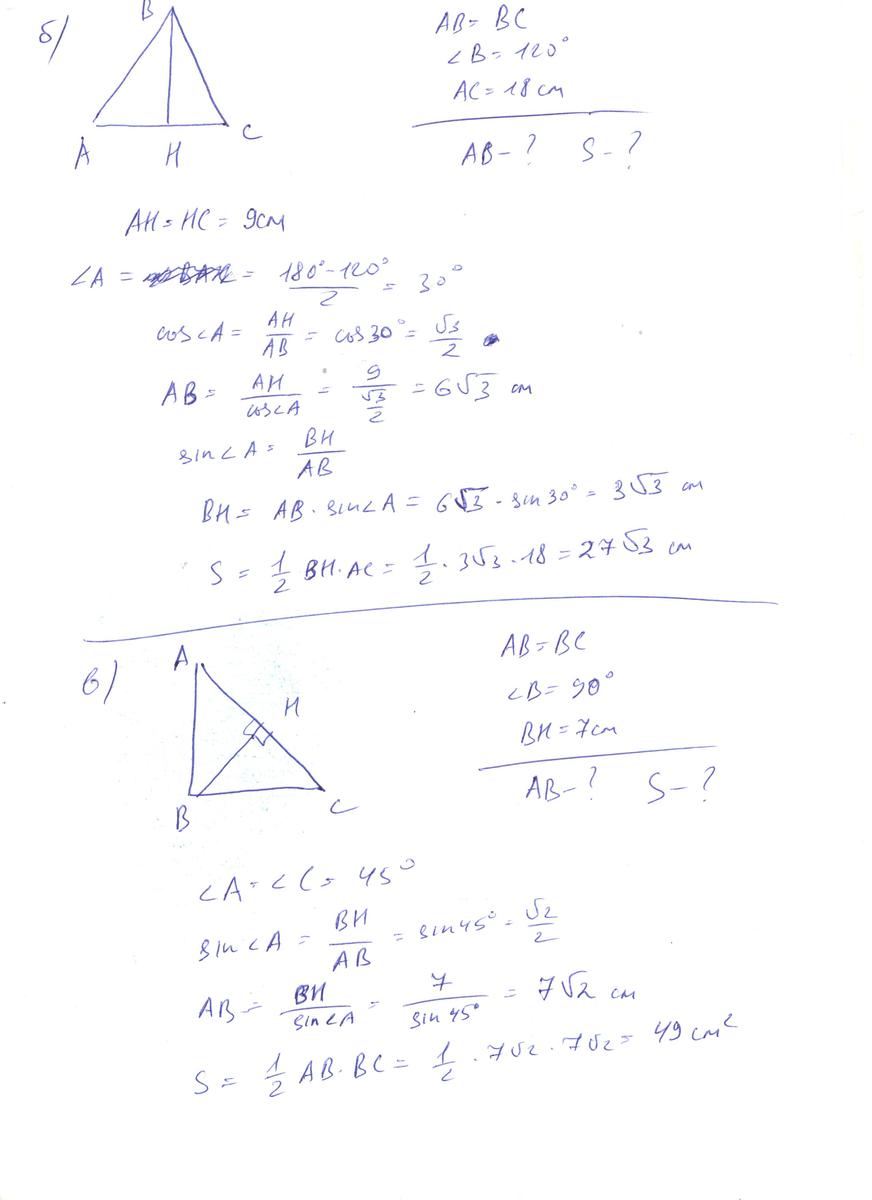Найдите боковую сторону и площадь равнобедренного треугольника , если б) основание равно 18 см, а угол, противолежащий основанию, равен 120 градусов ; в) треугольник прямоугольный и высота, проведённая к гипотенузе , равна 7 см.