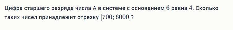 3. Цифра старшего разряда числа A в системе с основанием 6 равна 4. Сколько таких чисел принадлежит отрезку [700;6000]?