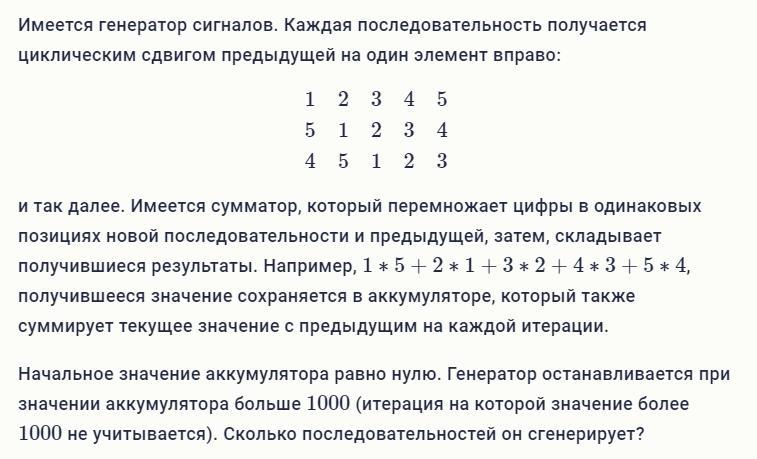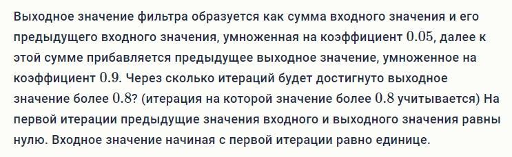 2. Выходное значение фильтра образуется как сумма входного значения и его предыдущего входного значения, умноженная на коэффициент 0.05, далее к этой сумме прибавляется предыдущее выходное значение, умноженное на коэффициент 0.9. Через сколько итераций будет достигнуто выходное значение более 0.8? (итерация на которой значение более 0.8 учитывается) На первой итерации предыдущие значения входного и выходного значения равны нулю. Входное значение начиная с первой итерации равно единице.