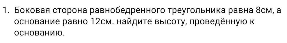 Назовём треугольник АВС, где А - вершина слева, В - сверху, С - справа. Высота (назовём АD), проведённая к основанию, образует прямоугольный угол BDA. AD=6 см, так как высота, проведённая к основанию в равнобедренном треугольнике, является также медианой. По теореме Пифагора: BD^2 = корень из АВ^2 - AD^2 = корень из 8^2 - 6^2 = 64 - 36 = 28