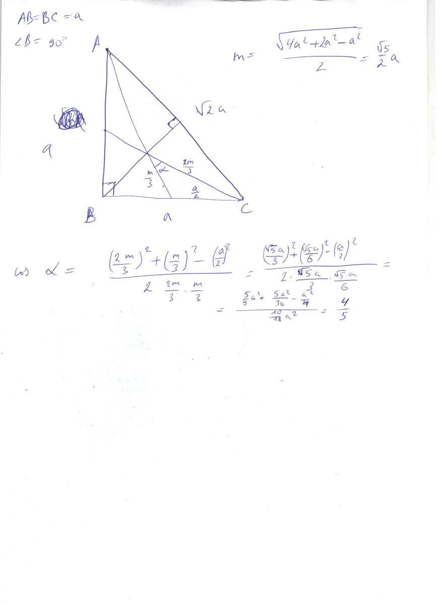 В прямоугольном равнобедренном треугольнике проведены медианы из вершин острых углов. Найдите острый угол между этими медианами.