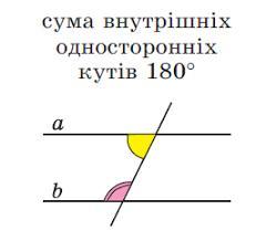 Якщо при перетині двох прямих січною, сума внутрішніх односторонніх кутів дорівнює 180 градусам, то задані прямі паралельні.