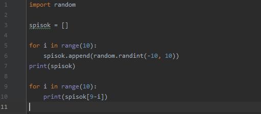 Створити список з 10 випадкових елементів (від -10 до 10). Надрукувати елементи списку в зворотньому порядку.