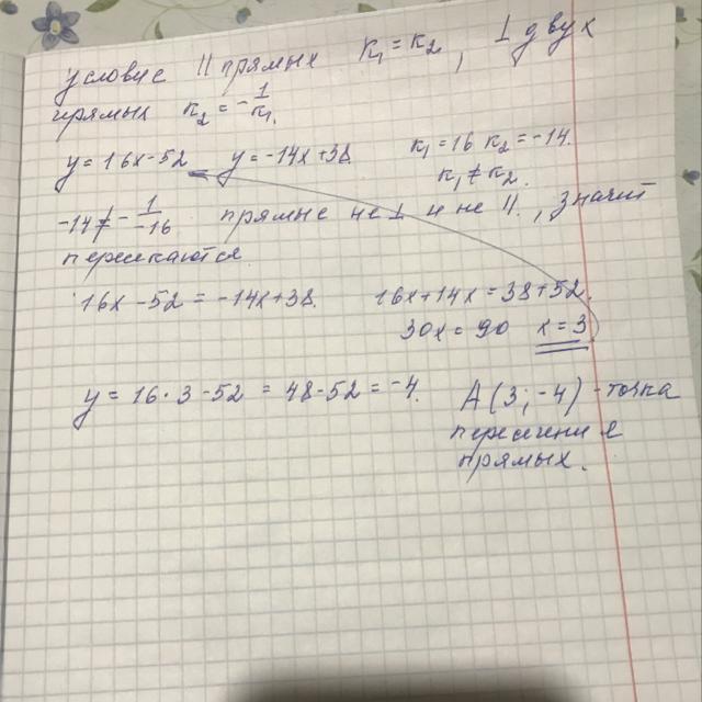 Каково взаимное расположение графиков функций y=16 x - 52 и y=-14x + 38 В случае пересечения графиков найдите координаты точки их пересечения