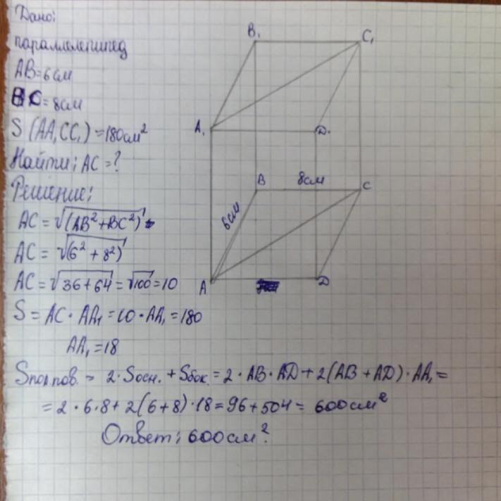 В прямоугольном параллелепипеде длины сторон 6 см и 8 см, а площадь диагонального сечения равна 180 см² . Вычисли площадь полной поверхности параллелепипеда.