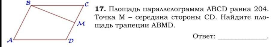 Площадь параллелограмма ABCD равна 204. Точка M - середина стороны CD. Найдите площадь трапеции ABMD