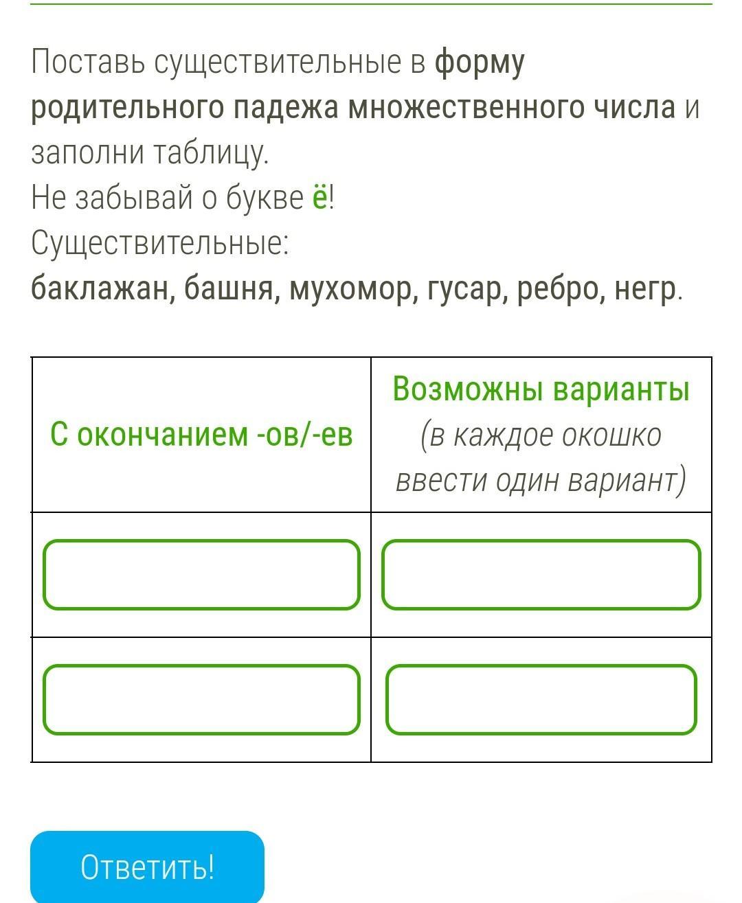 Поставь существительные в форму родительного падежа множественного числа и заполни таблицу.