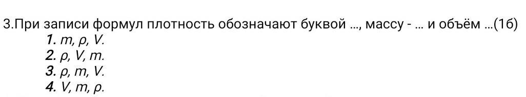 3.При записи формул плотность обозначают буквой …, массу - … и объём …(