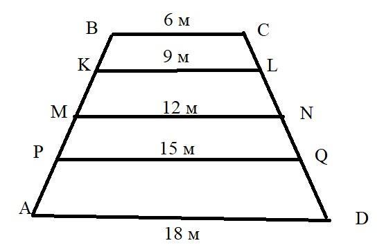 Найдите длины этих отрезков, если основания трапеции равны 6ми 18 м.