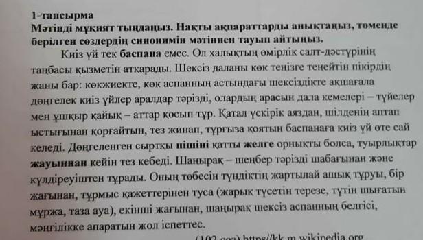 мазмұндау кезінде қарамен берілген сөздерді синонимдерімен бірге қолданыңыз. баспана, пішіні, жауыннан, желге