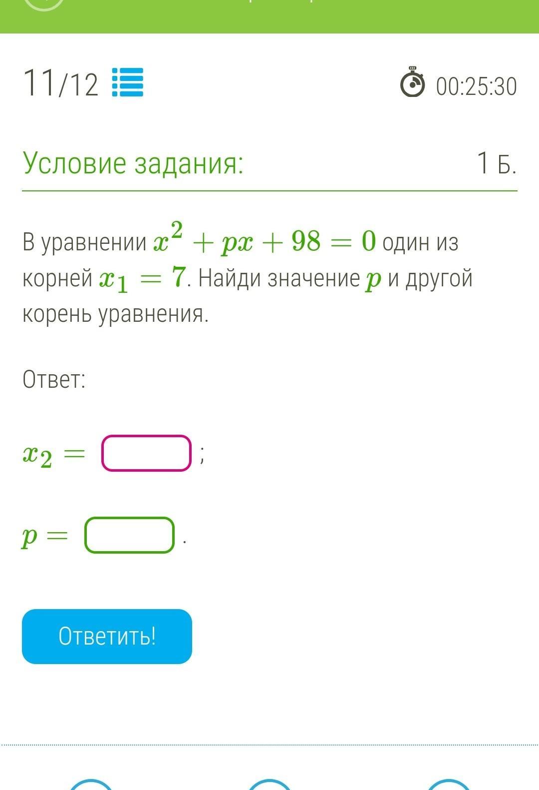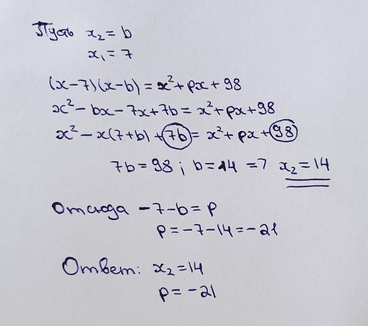 ответ: х2=14, p=-21