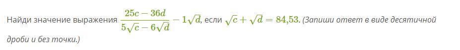 25c-36d/5√c-6√d-1√d=(5√c-6√d)(5√c+6√d)/ 5√c-6√d -1√d =5√c+6√d-1√d=5√c+5√d= 5(√c+√d)=5×84.53=422.65=423