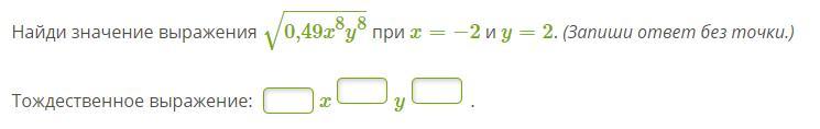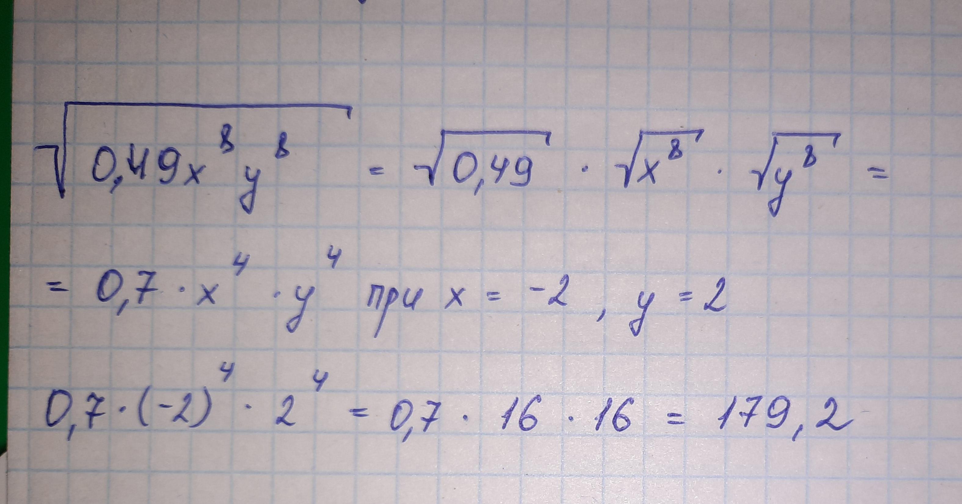 √0.49x⁸y⁸=√0.49×√x⁸×√y⁸=0.7x⁴y⁴=0.7×(-2)⁴× (2)⁴=0.7×16×16=179.2