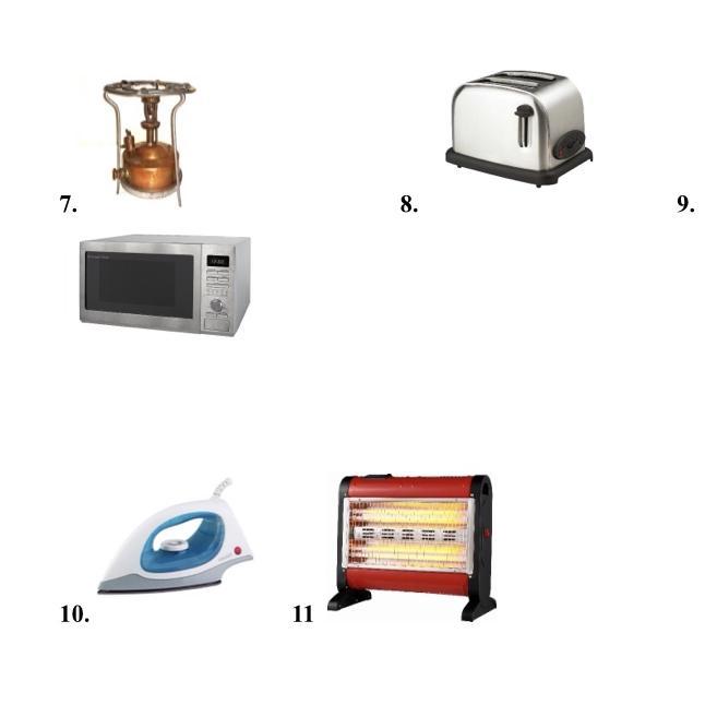 7) горелка ( если не ошибаюсь, хотя может быть и примус, раз электро) ), 8) Тостер, 9) Микроволновая печь 10) Утюг и 11) Обогреватель