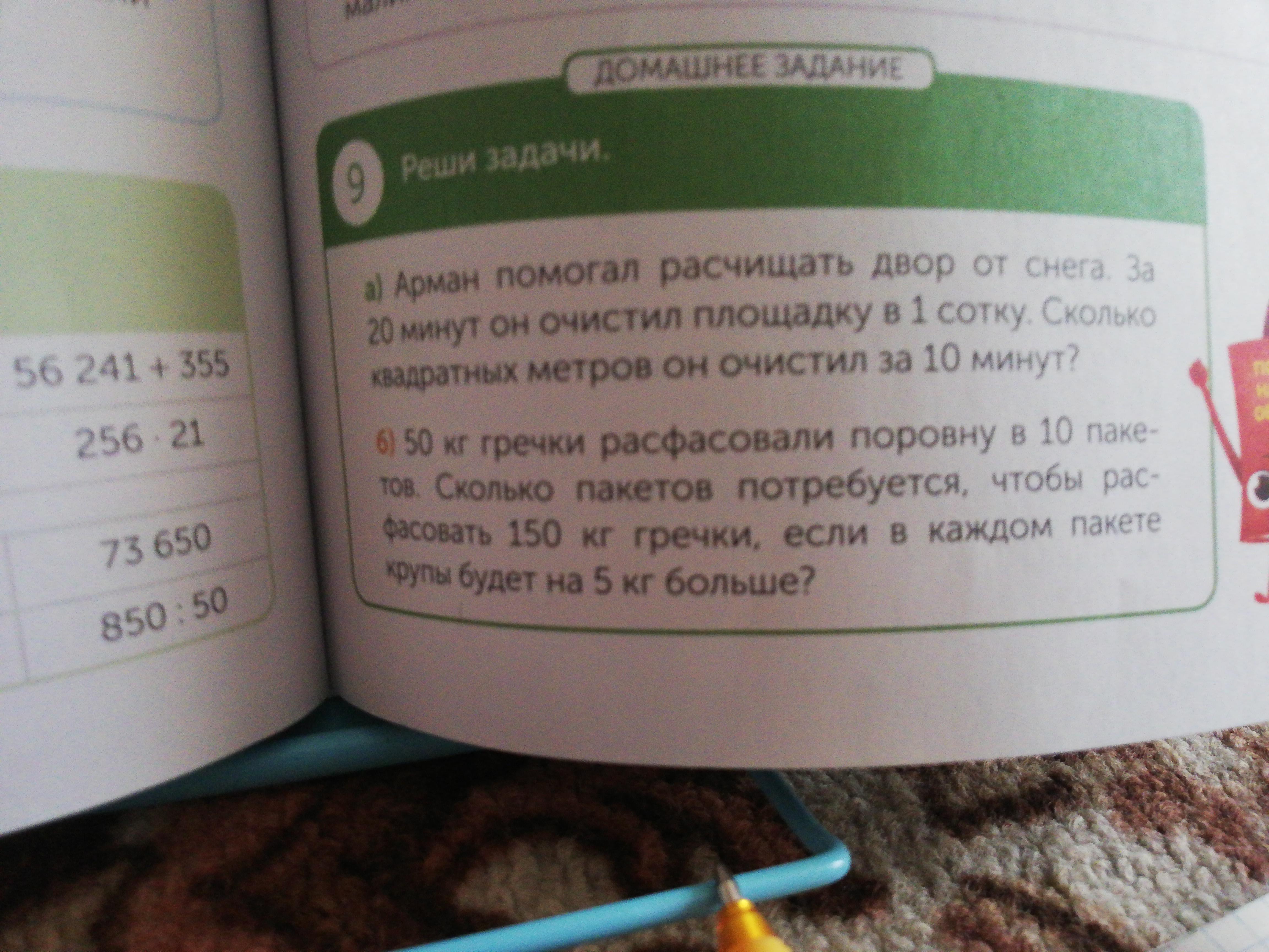 Как записать условие и решения к этим задачам Первая Арман помогал расчищать двор от снега за 20минут он очистил площадь в 1 сотку сколько квадратный метров он очистил за 10 минут Вторая 50кг гречки расфосовалипоровну в 10 покетов сколько пакетов потребуется чтобы расфасавать 150кг гречки если в каждом пакете крупы будет на 5кг больше