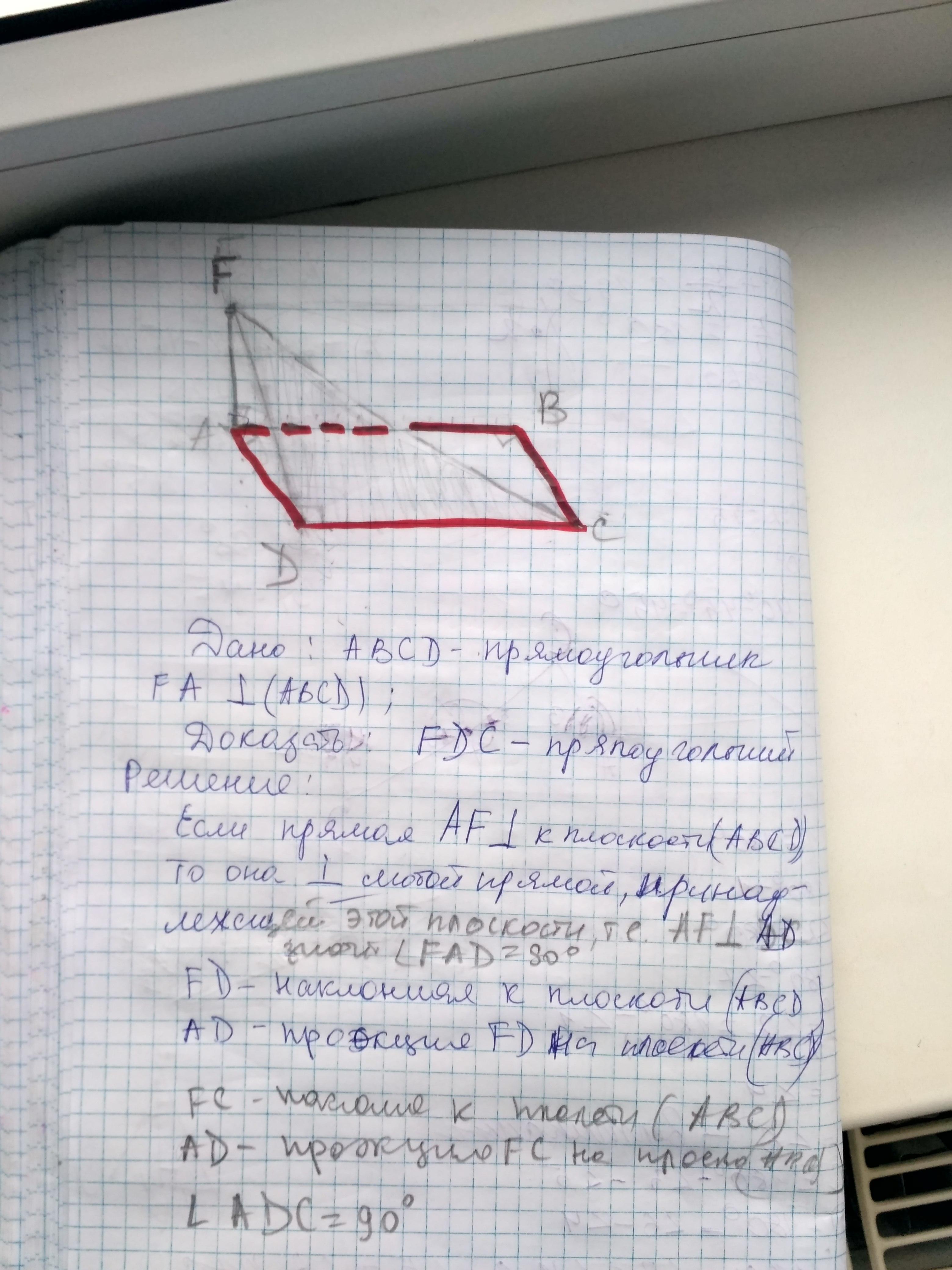 Из точки F проведен перпендикуляр FDC к плоскости прямоугольника ABCD. Докажите, что треугольник FDC прямоугольный.