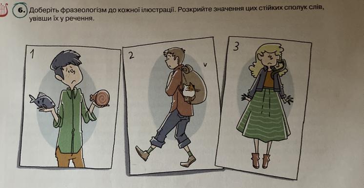 6.) Доберіть фразеологізм до кожної ілюстрації. Розкрийте значення цих стійких сполук слів,