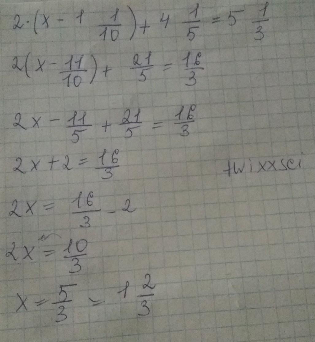 Решите уравнение: 2∙(х-одна целая 1/10)+четыре целых 1/5=пять целых 1/3 по дискриптору
