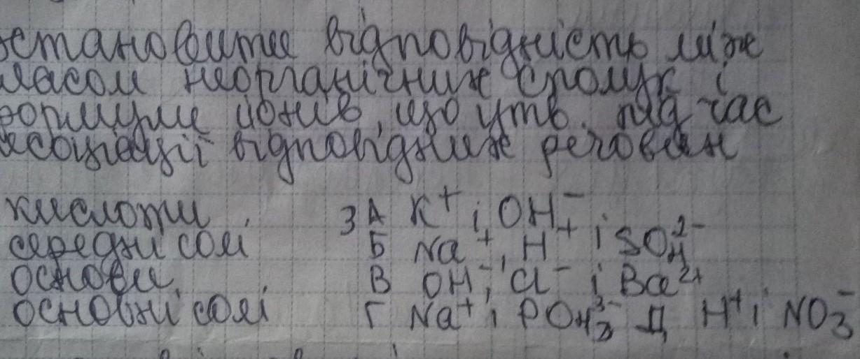 установіть відповідність між класом неорганічних сполук та формулами йонів, що утворюються під час дисоціації відповідних речовин