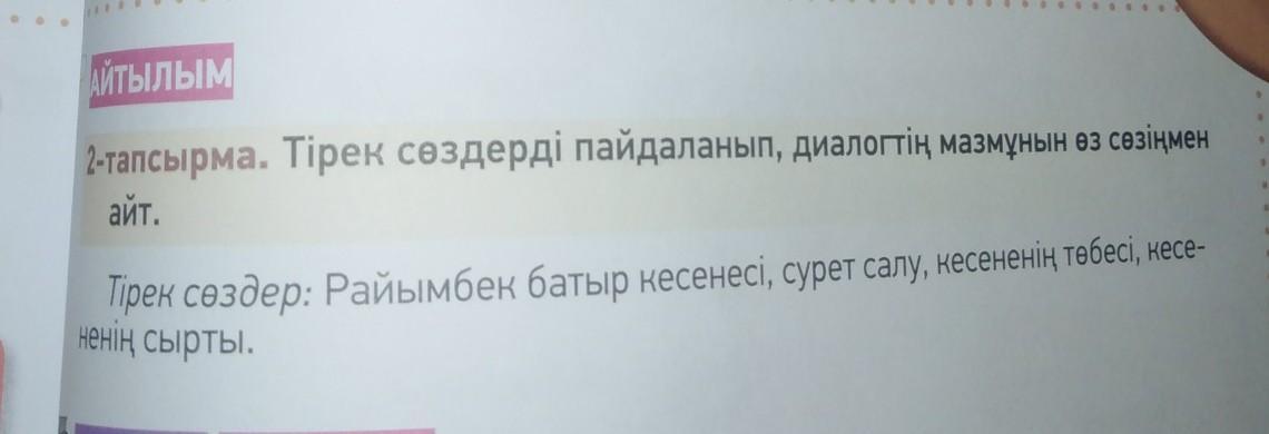 тапсырма. Тірек сөздерді пайдаланып, диалогтің мазмұнын өз сөзіңмен